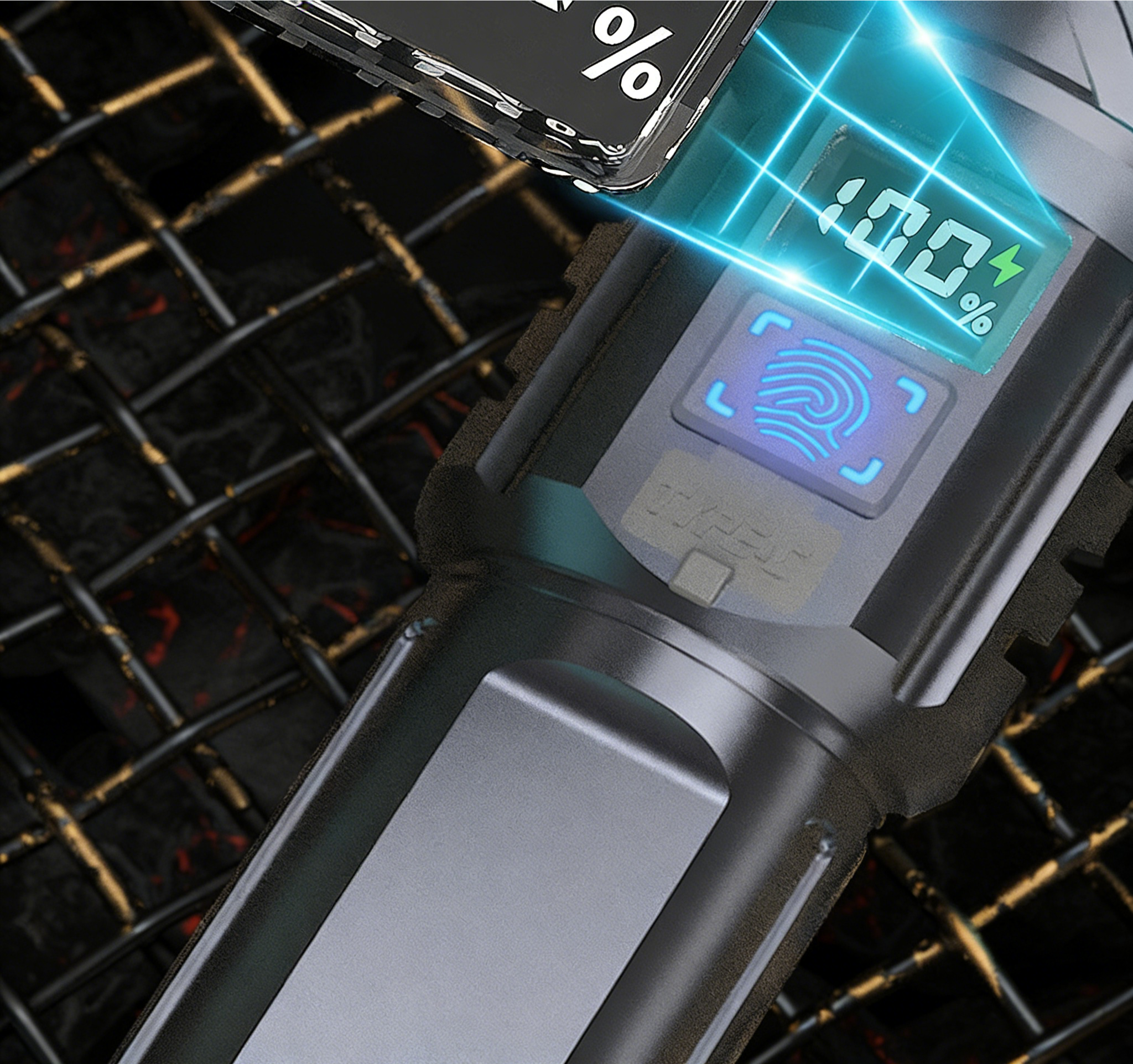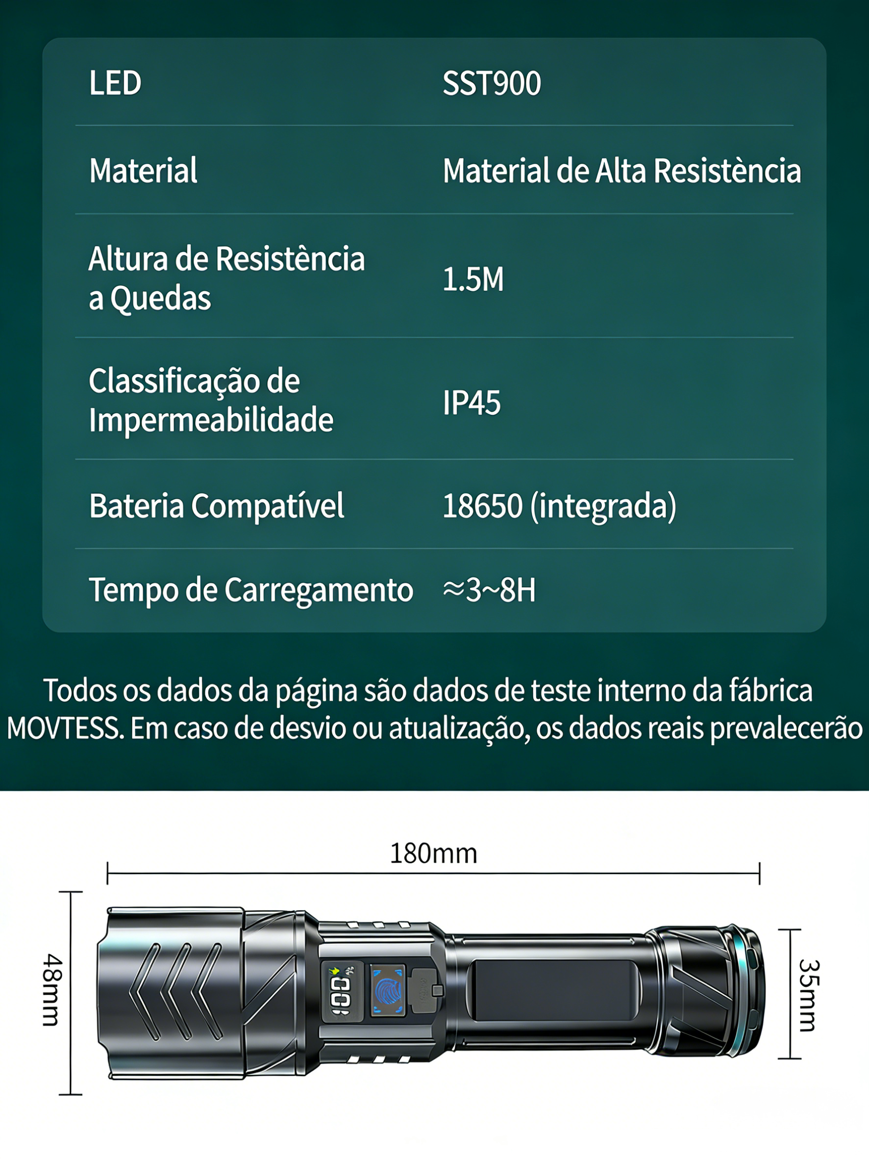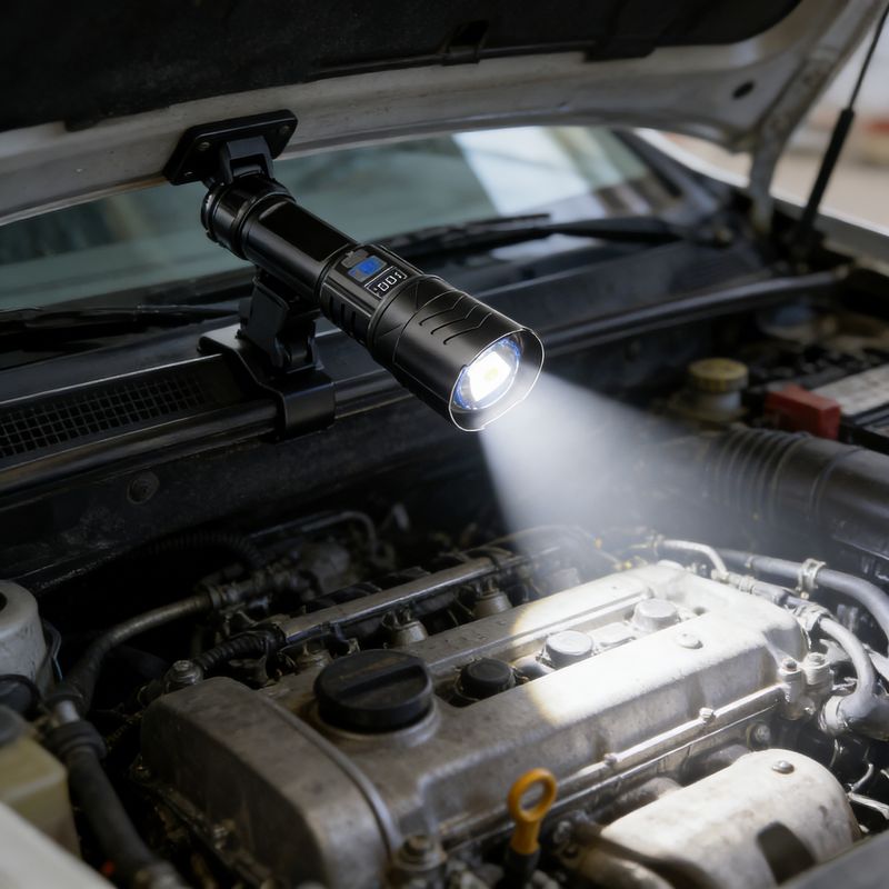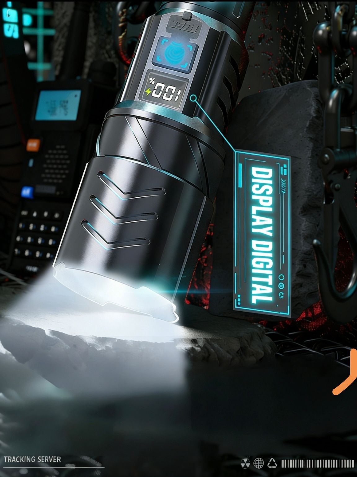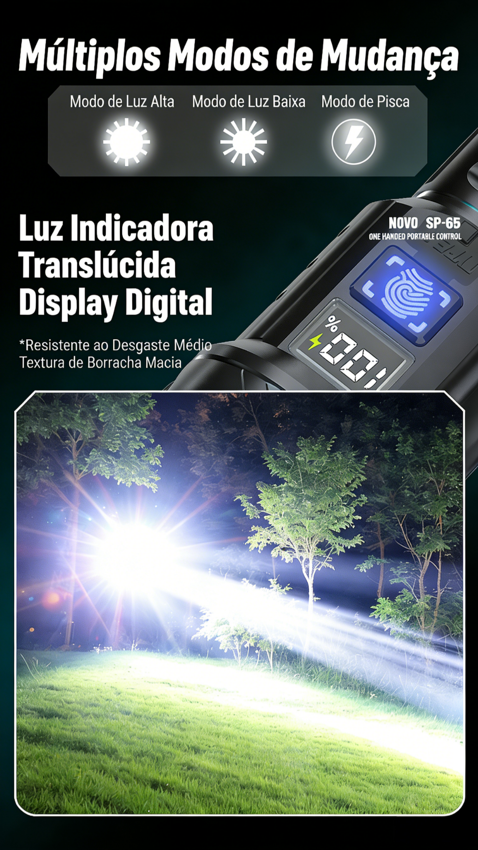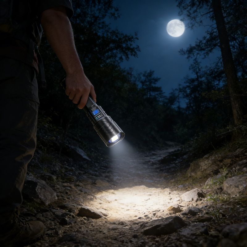 Uma lanterna de emergência ao ar livre super brilhante recarregável com baterias de longa duração e luzes LED com tecnologia preta LED light.